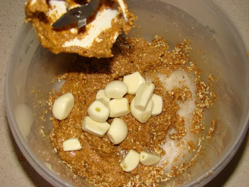 прожарений кунжут ізмельчаєм з додаванням олії… потім — часник..